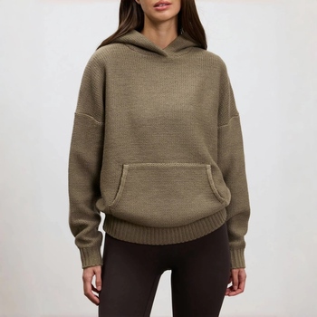 Suéter de punto con capucha personalizado al por mayor para mujer, comodidad para todas las estaciones, dobladillo canguro informal de gran tamaño con bolsillo acanalado